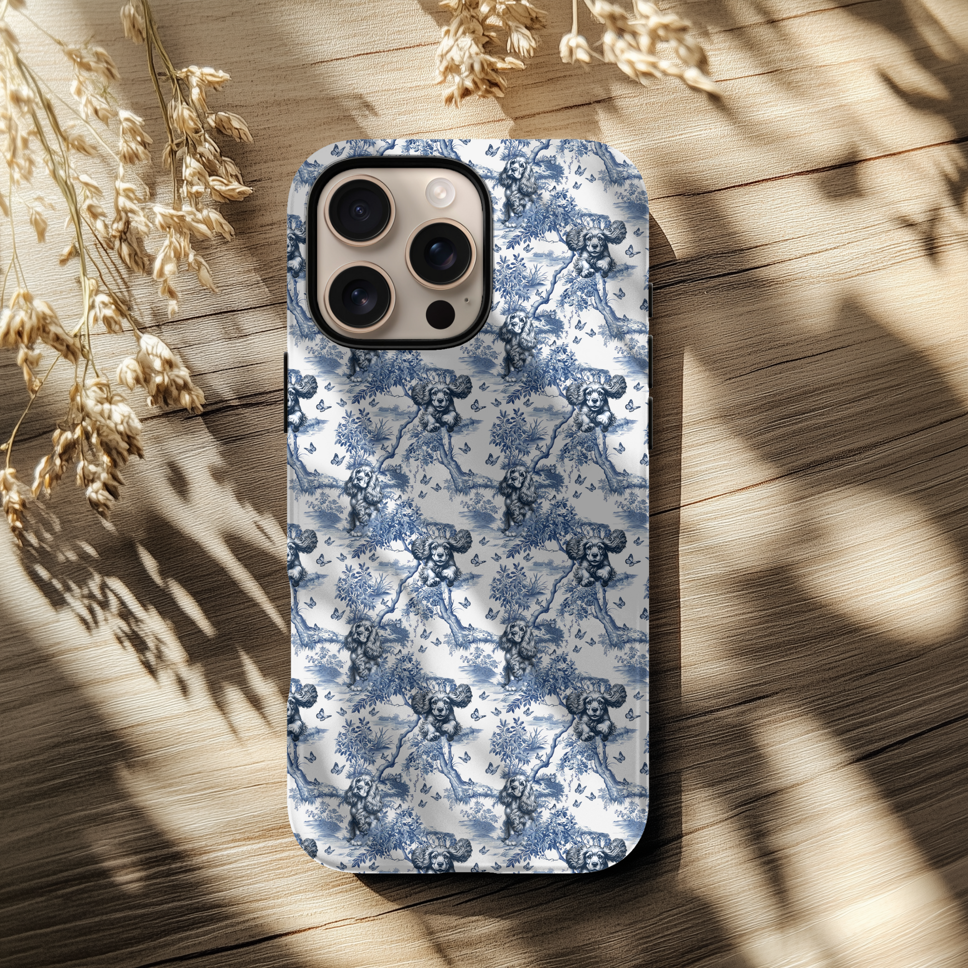 Dual-layer protection — polycarbonate shell over TPU lining — built to handle daily impact while the signature OhMyTails toile travels with you. Choose matte or glossy finish, charge wirelessly (not MagSafe supported), and carry your Cocker Spaniel with you everywhere.