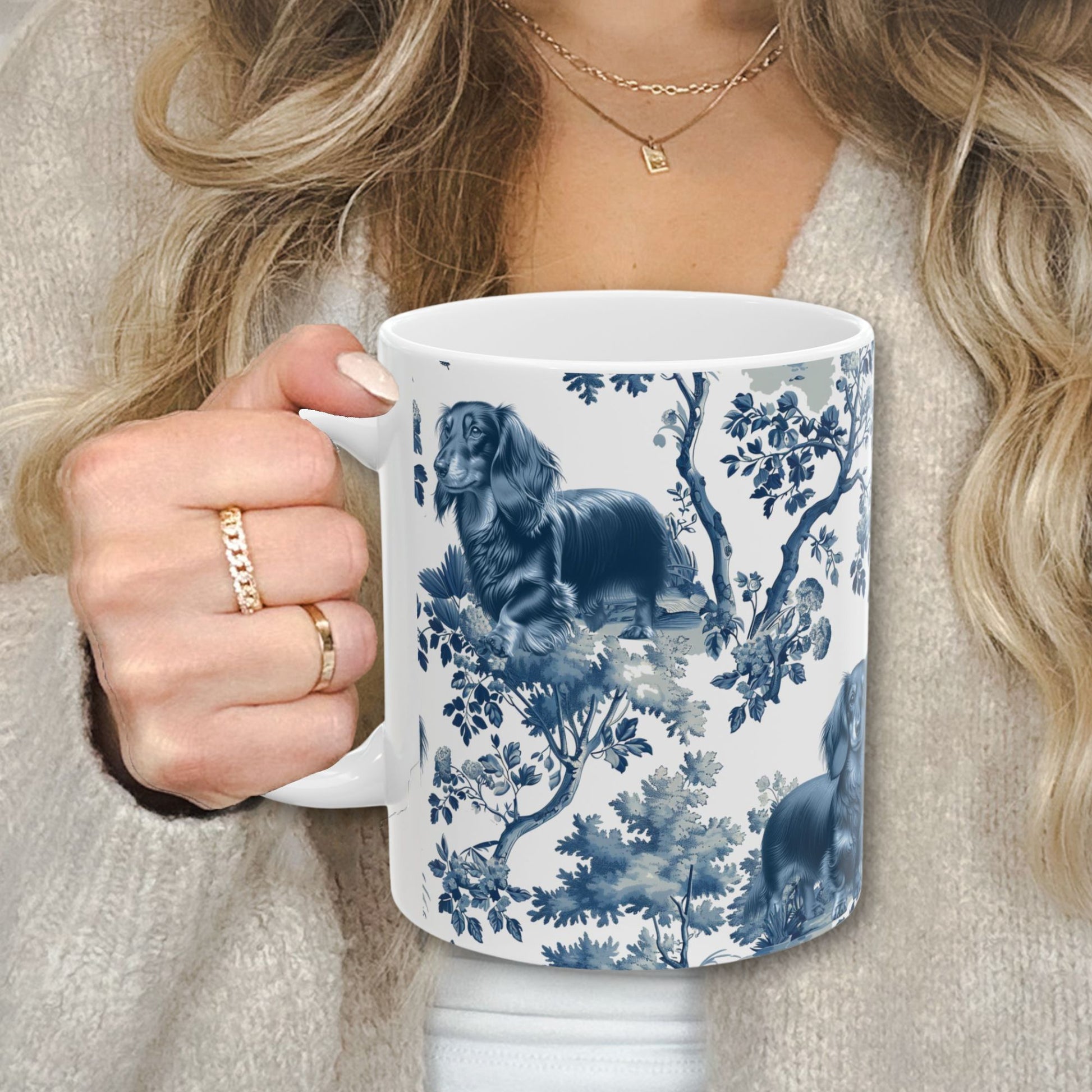 The love is real. The Longhaired Dachshund obsession is real. And this mug? Just as real as both. Our exclusive Longhaired Dachshund toile pattern brings elegant French design to your favorite obsession - printed in crisp, vibrant detail on glossy white ceramic. It's the kind of mug that sits on your desk and makes people ask "where did you get that?" Choose 11oz for your "just enough caffeine to function" days or 15oz for "I'm going to need reinforcements" mornings. They're your world. This is your mug. Simple as that.