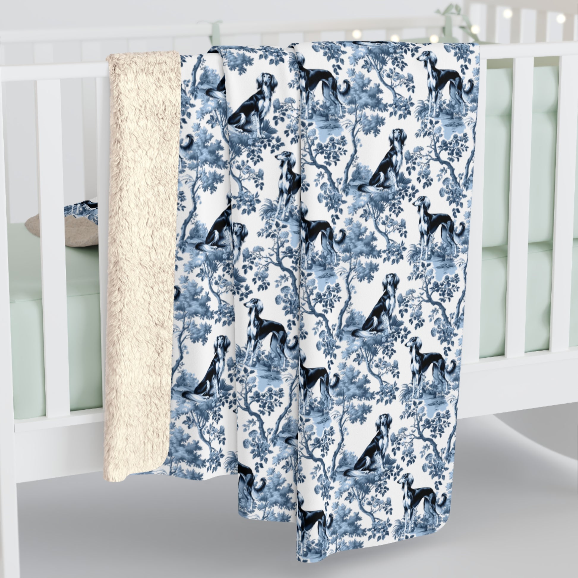 With a smooth printed Saluki toile pattern front and plush sherpa backing, this blanket delivers wrap-around coziness. The sherpa fleece adds warmth without bulk — perfect for sofas, beds, or anywhere you want to get cozy. Printed and shipped in the USA.
